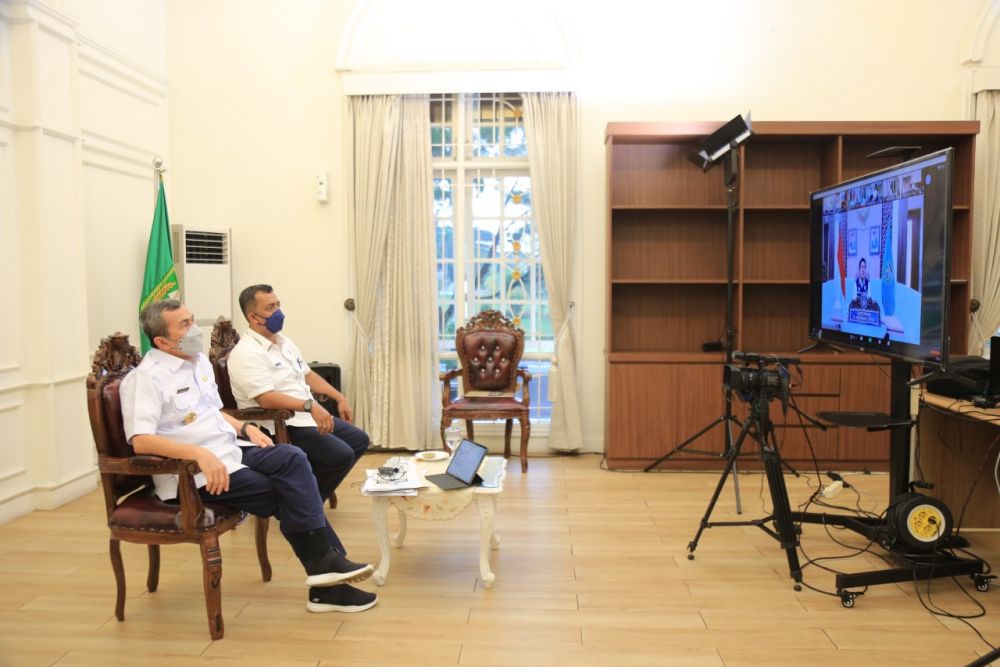 Gubernur Riau Syamsuar didampingi Kepala Dinas Pariwisata Provinsi Riau, Roni Rakhmat menjadi pembicara dalam webinar nasional dengan tema Sumatera Travel Destination Summit, Rabu (2/6/2022)/mcr