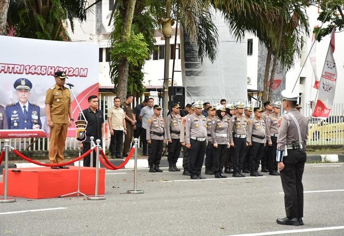 Tampak Ginda Burnama saat mengikuti Apel Kesiapan Pengamanan Malam Takbiran dalam rangka menyambut hari raya Idulfitri 1445 H/2024 M yang berlangsung di Jalan Gajah mada, Selasa (9/4/2024).